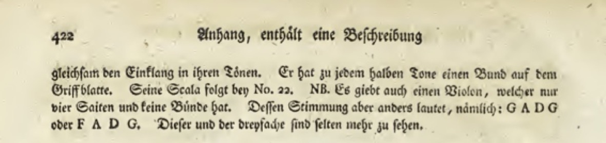 Albrechtsberger refers to the double bass as Violon or Contrabaß and states that the five strings are made of sheep gut, the lowest two of which are wound (with metal wire). Similar to the viola da gamba, a fret is placed at every half step on the neck of the instrument. He also mentions that there are four-stringed double basses (Violon), that have no frets and are tuned either G-A-D-G or F-A-D-G.