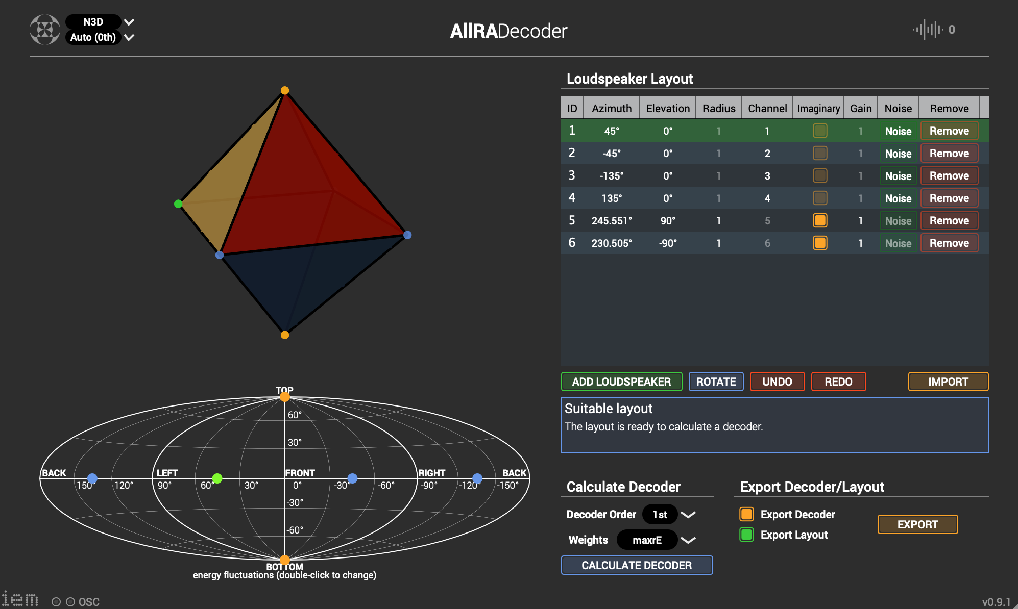In many studios who have fixed ambisonics setups, it is often the case that the decoders have been made beforehand, calculating the coordinates of each speaker. This data can be exported and saved in a .json file and can be imported in a decoder using the IMPORT button.