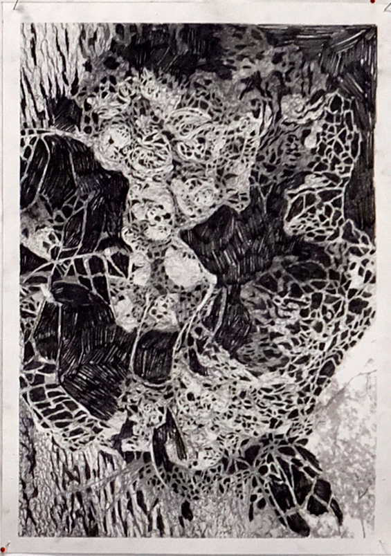Sustained awareness, attention, and focus make the three dimensional visible at a glance, yet pull the gaze towards and inwards. The wild and free alternations of the pencil invite entry into a fugue conjured with patience and craft. The drawings are an invitation into the imaginary and the dreamlike—to a place where transformation transpires and form is transfigured into textured patterns in an unruly unity. Contemplation can be traced through movement and sense. Focus seen through expansion, enlargement, and revelation. Bursts of sharp concentration felt through unperturbed motion and action. The artist understood to be drawing from experience in order to experience.