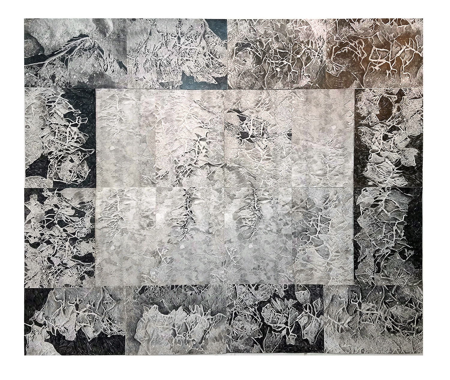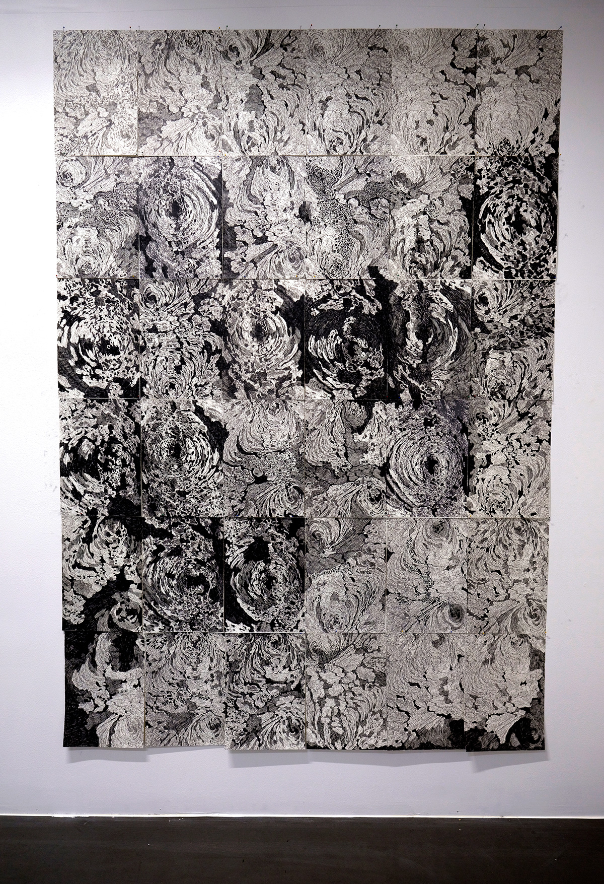 A tree; wood turned into a pencil, multiple sheets of paper; a branchlike hand that maps the surface and transforms its impression into a wide range of tones and expressions; light to dark, contrast in balance, a multitude of spaces journeyed through, depth and flatness textured and wowen into a natural caos laid out for reflection and wonder. Tone fluctuating on a surface at hand, as seen on a surface discovered and explored. Becoming flow that allows for a suspension in time as atmosphere is materialised.