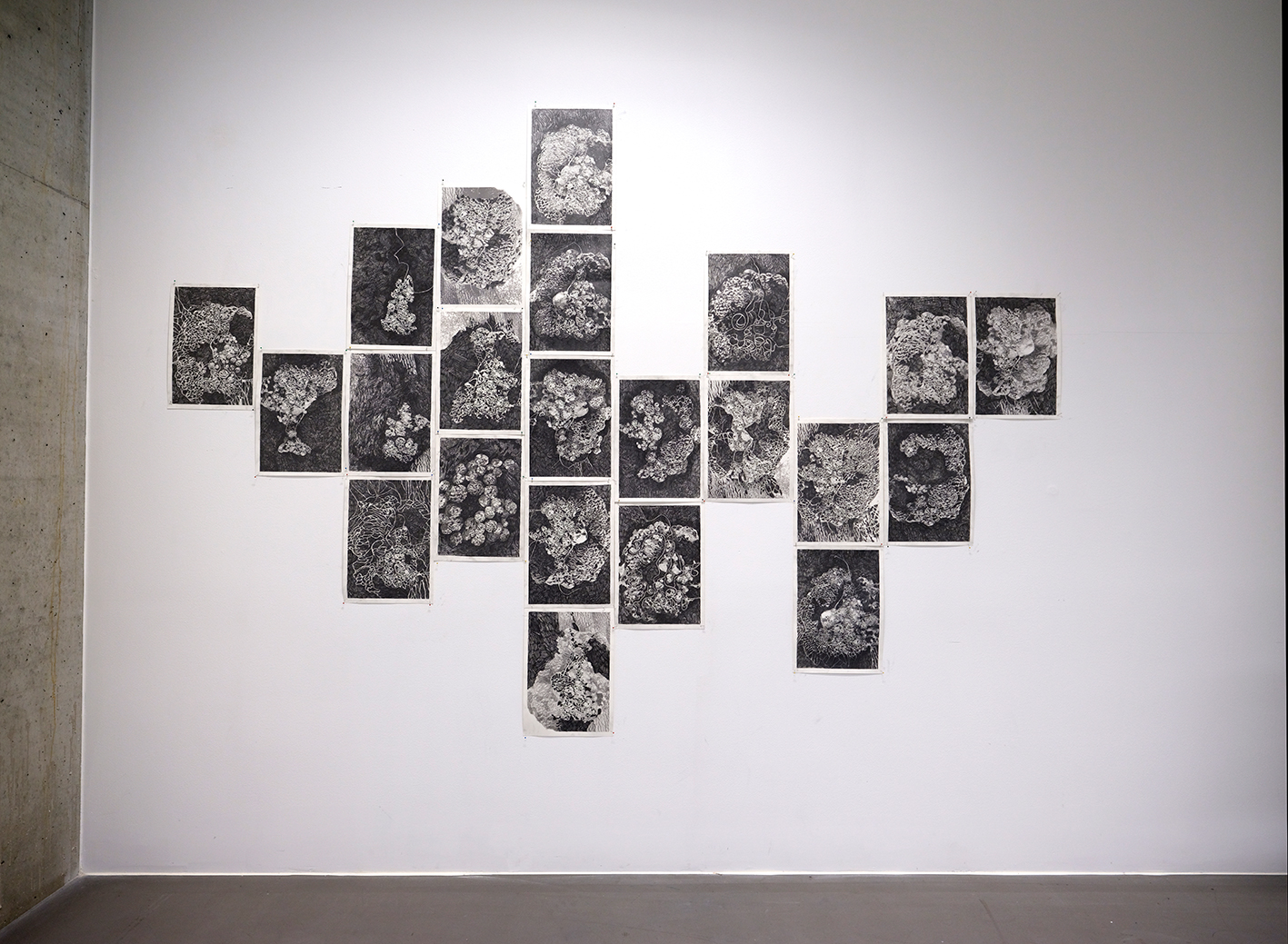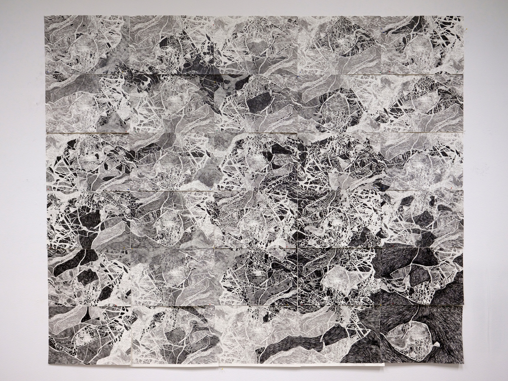 The photograpic image is transfered via a risograph onto a surface that is suitable for drawing. The visual intrepretation happens in the organic structure, in the space between, in the rythms and in the lines. The drawing process is like drawing in pixels – while each module is a A3 format. Throughout the prosess the drawings are composisioned, arranged and rearranged, with the intention to form a new image still unknown and unseen - while some of the underlying and known image is still visible like fragments and fractals of the wholeness.