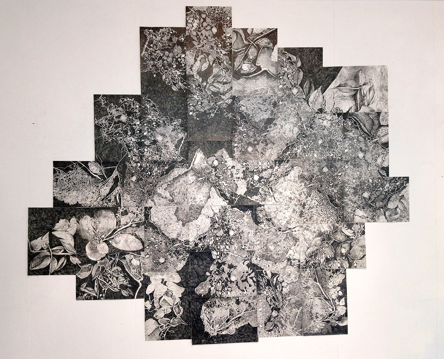 I work with a kind of system that contain several single formats put together to form a larger drawing. The drawings contains a large number of copies of the same photograpic image which is interpreted through drawing. The modules are a photographic image taken from a tree – in one of the system – is the bark, in other it is the roots and the third one shows forms that grows out of the surface.