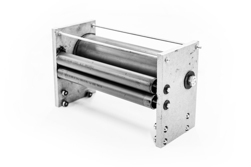 The printing cylinder and ink rollers, in turn, in addition to starting from PVC tubes, also received iron rods inside which 6 round pieces made in 3D printing with the same diameter as the inner part of the PVC tubes were placed. These parts were designed to support the PVC tubes, since the material is slightly malleable. In lack of specialized cutting tools, eg. a laser cutter, these parts were produced on an Elegoo Mars FDM 3d Printer with ABS plastic filament.