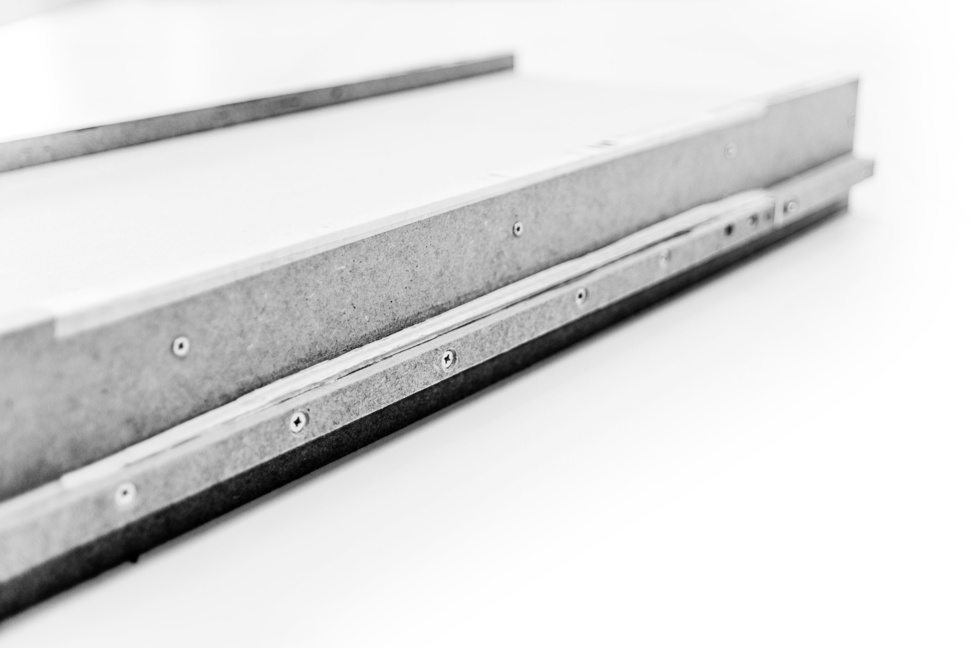From these materials, the main parts were built. The printing base was assembled from the MDF pieces that were glued and screwed. The gutters, through which the ink rollers and the printing cylinder move, were also built with MDF. From 19mm MDF thick pieces glued together, the gutter was built in two levels for the back and forth movements of the cylinders. One of the levels is linear and the other has elevation and slope sections.