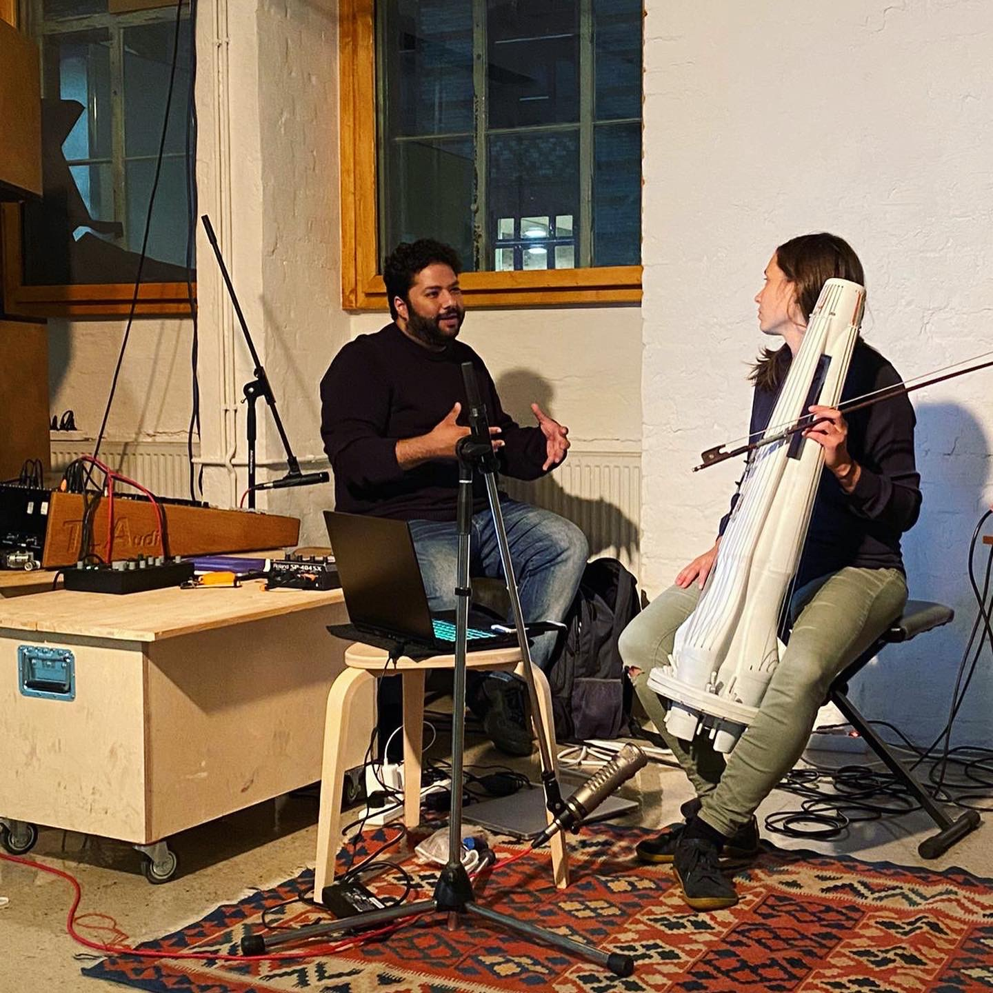 Takeaways from this collaboration also included a moment within a piece that embodies the full music expression of having 24 strings tuned into an unconventional tuning system. I was able to rotate the instrument freely and explore its widest combinations of tones and open strings. In this improvisation I was inspired to understand the relationship of formats by working with artistic qualities that could represent Balance proportion and contrast along the performancein relation to the combination of the visuals projected around me.