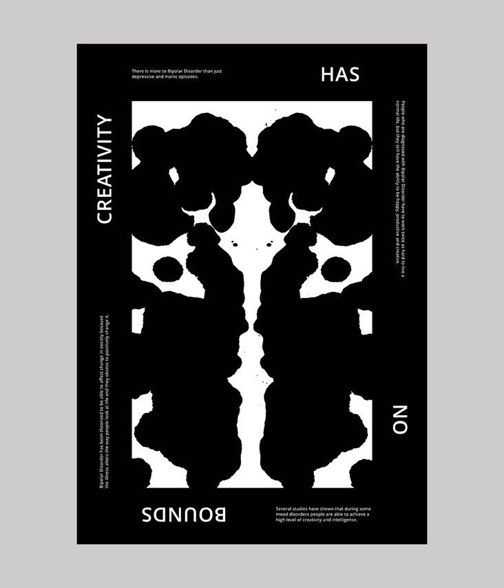 Bi-Polar: Rather than focusing on the down side of this health issue we decided to try to demonstrate how being bi-polar can enhance creativity. This poster was designed to inform people about the positive effects of bi-polarity.