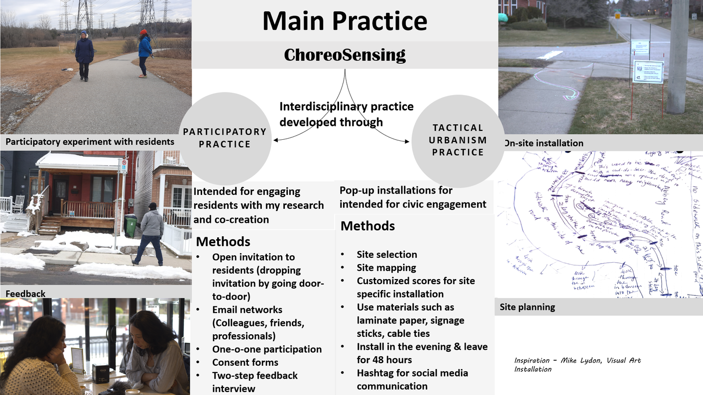 Sensory practice - Choreographic practice (for score development) - Participatory practice - Tactical Urbanism practice