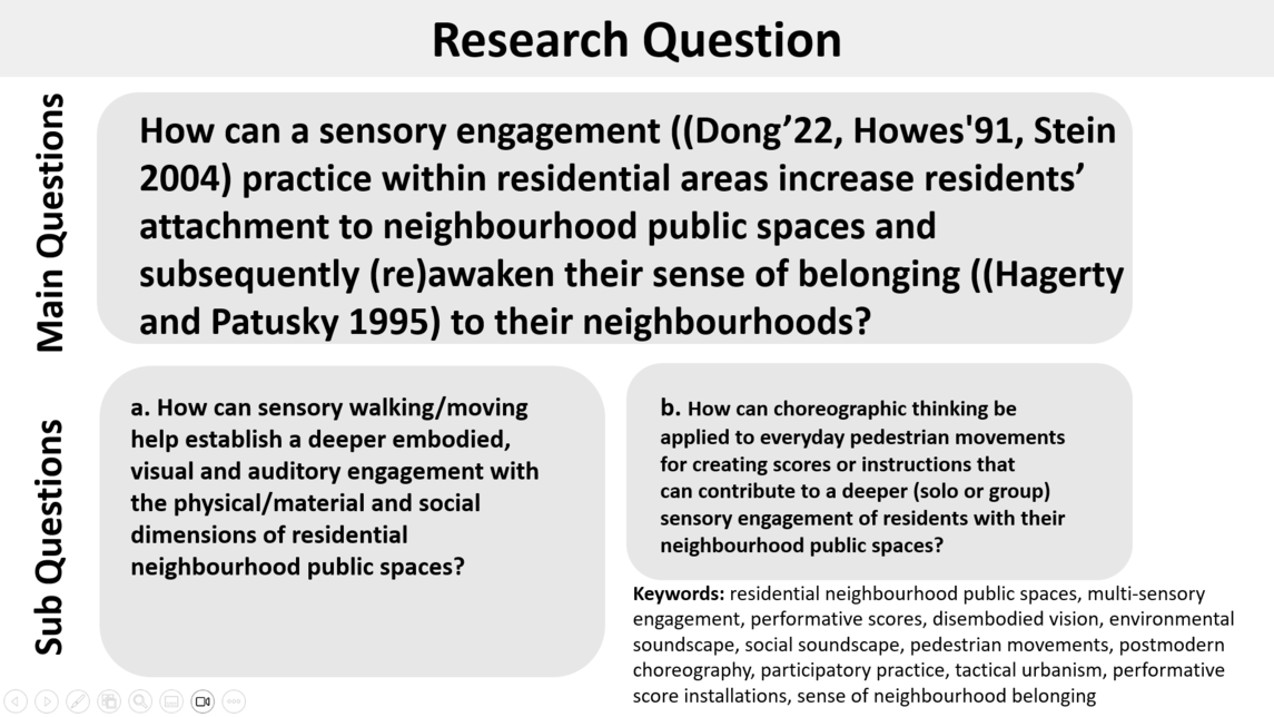 Keywords: residential neighbourhood public spaces, multi-sensory engagement, performative scores, disembodied vision, environmental soundscape, social soundscape, pedestrian movements, postmodern choreography, participatory practice, tactical urbanism, performative score installations, sense of neighbourhood belonging