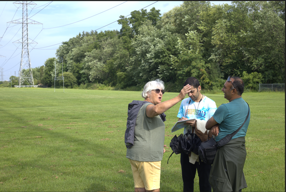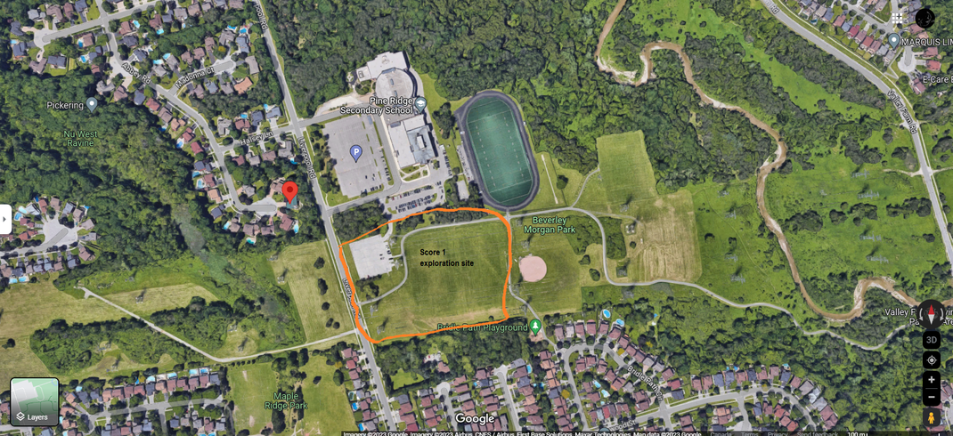 Although the score asked them to explore the social life at the site, participants seemed more interested in exploring the natural environment of the park. They looked at the green willow tree in front of them on one side of the park, the Hydro Poles and the expansive field on another side, the houses on Liverpool road and the high school on their final side of viewing. Because of the weekend and summer holidays, participants mentioned that they did not notice much social activities around. They noticed a few children riding their bikes, a middle-aged man riding his skateboard and a highschool student learning to drive. Those were the only social activities that they identified. The other activities that interested them were the construction site at the schoolyard and the backyard of a large old house right next to the park.