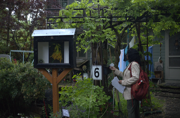 Image 36: Participant leaving the intervention at the site. The wooden plaque contains the 3 new names the participant gave to 'Third Street' based on his exploration of perceptual innuendos.