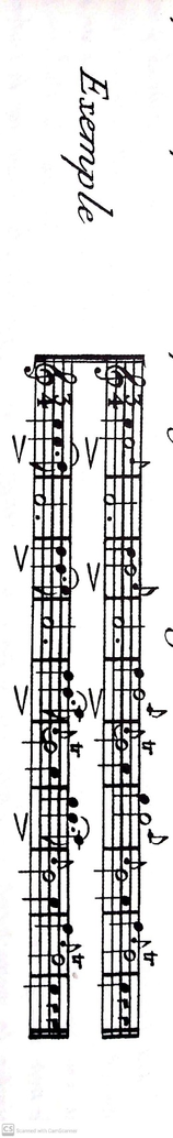 In addition, in this earliest method, Vangerhagen also wrote of the martellement (or mordent), an ornament that was omitted from later editions. When discussing the mordent, Vanderhagen stressed the difference between that and a trill, by suggesting that, while a trill borrows the note above the main note, the mordent borrows the one below it. Furthermore, unlike the trill, the mordent starts from the main note, and not from the borrowed one (example 8.12).