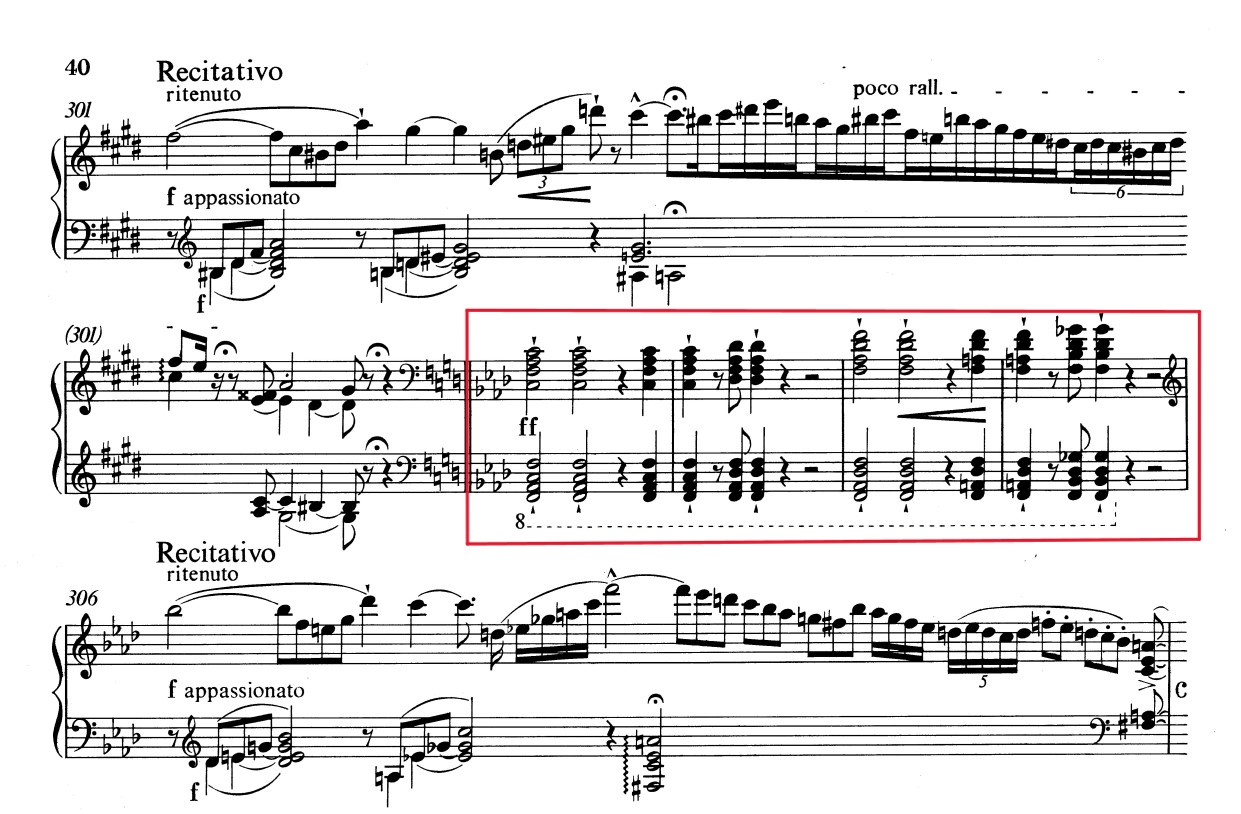 So, the Cross symbol is always used by Liszt to symbolize the Holy Cross and, for analogy, Christ and God, and he doesn’t make an exception for the Sonata. Liszt puts together two Cross symbols to create Christ’s theme. We find this theme used programmatically seven times in the Sonata (on the symbology on the number seven c.f.r. 4.2), and especially in three crucial points: once in the Grandioso section (bars 105 – 119), in which, together with the plagal Amen formula21, it symbolizes Christ and His promise of redemption; once during the Recitativo Appassionato section (bars 297 – 310, Example 5), in which it can refer to the Crucifixion and Christ Passion; and once in the Presto section (bars 700 – 710, Example 6), in which it can symbolize Christ at the Last Judgement during Armageddon. I will deepen this Christian interpretation in the next chapters (c.f.r. par. 4).