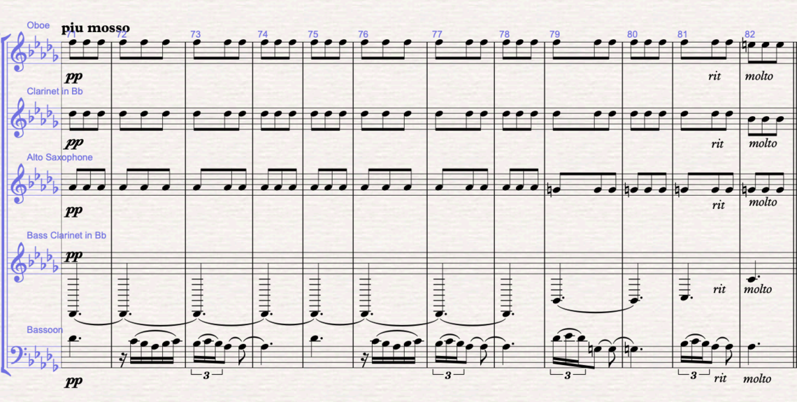 Figure 6 (m.37-48): Section B: the b theme is written in F minor. The melody is written in the oboe, and the harmonic mattress is written between the bass clarinet doing the pedal bass, the bassoon doing the arpeggios and the saxophone filling in with the 3rd and 11th of the f minor chord. From bar 42, the F minor chord becomes a Faug7 with the 9th. In bars 47-48 I write the answer to the melody in the clarinet. In bars 49-51 modulates to F major, and the clarinet takes over the accompaniment from the saxophone.