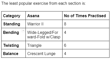 Once the participants completed their first BodyMap survey, they were given a practice diary to record which yoga exercises were practised each day. The diary included a list of 16 asana poses and 4 pranayama (breathing) exercises with a link to a GIF demonstration embedded to each exercise. A description and explanation for why each exercise was chosen is included in the personal case study. The 16 asana poses were split into four colour-coded categories (Figure 2.6) to differentiate their execution: standing, bending, twisting and balance. A guideline of 5 - 6 poses a day was suggested with a requirement for at least one exercise from each category to be practised each day. Underneath the asanas are descriptions of how to practise each breathing exercise. Below are the results of the amount of times each exercise was practised during the first week which gives us an insight into the popularity of each exercise.