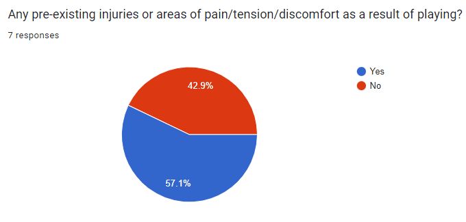 The participants of this case study consist of seven brass musicians at a postgraduate level. The instrument division is two trumpet players, two trombone players, two french horn players and one tuba player. Two of the participants are in the process of receiving their master's degree and another has graduated from a masters. The group contains three male-identifying musicians and four female-identifying musicians. The gender ratio is balanced for each instrument except for trombone (two female participants) and the tuba participant (only one male participant). In the group, six of the seven participants had experience with yoga (Figure 2.0) however most reported irregular frequency of practice with only one reporting regular yoga practice “Have practiced yoga frequently for the past four years”. Four of the seven participants reported having experienced an injury or pain during practice of their instrument (Figure 2.1).