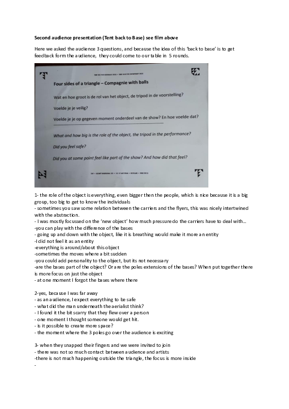 The second time the audience got 3 questions: see PDF on the right. How big is the role of the object in the play, did you feel safe, and did you feel part of the show at some point.