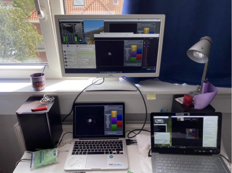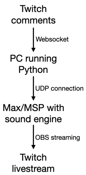 In order to create my own interactive system based on Twitch Plays Pokémon I had to use code that creates a Websocket (TCP/IP connection) between the Twitch comment section and my own computer. After some online searching, I was able to find a repository by Geert Verhoeff with the necessary Python code to run such a system.8 The Python code could only be run on a PC machine so a second computer was used to run the WebSocket code. The data gathered was then sent to my main Mac computer, via a local UDP connection, which also ran a Max/MSP sound engine and a streaming service. The following scheme and picture summarise the connections made and the physical setup:
