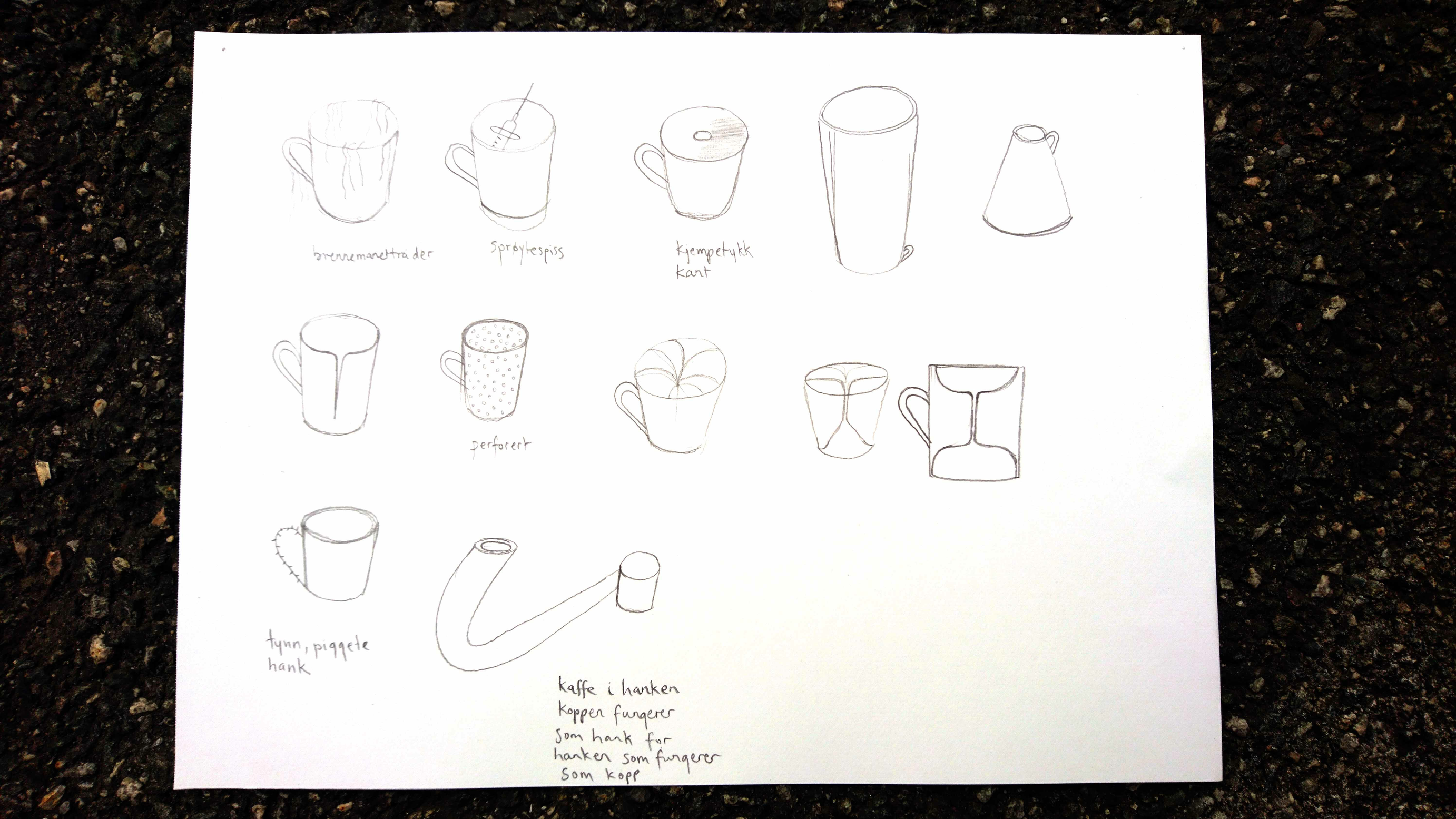 To unfold what a coffee cup doing the opposite of what I expect from it (make me able to drink my coffee in a comfortable way) might look like, I start drawing disobedient and rebellious cups; cups that hurt you when you drink from them, cups that are difficult to hold or that refuses to contain liquid. Since the handle and the edge of the cup are the most important points of contact between me and the cup, they are also the parts most important to consider in the design of disobedient cups. I started drawing cups that really hurt you, eventually moving towards drawing cups that are not directly hurtful but just uncomfortable or trying to fool you. I start with the most obvious ideas, like sharp objects on the edge and handle, and go from there.