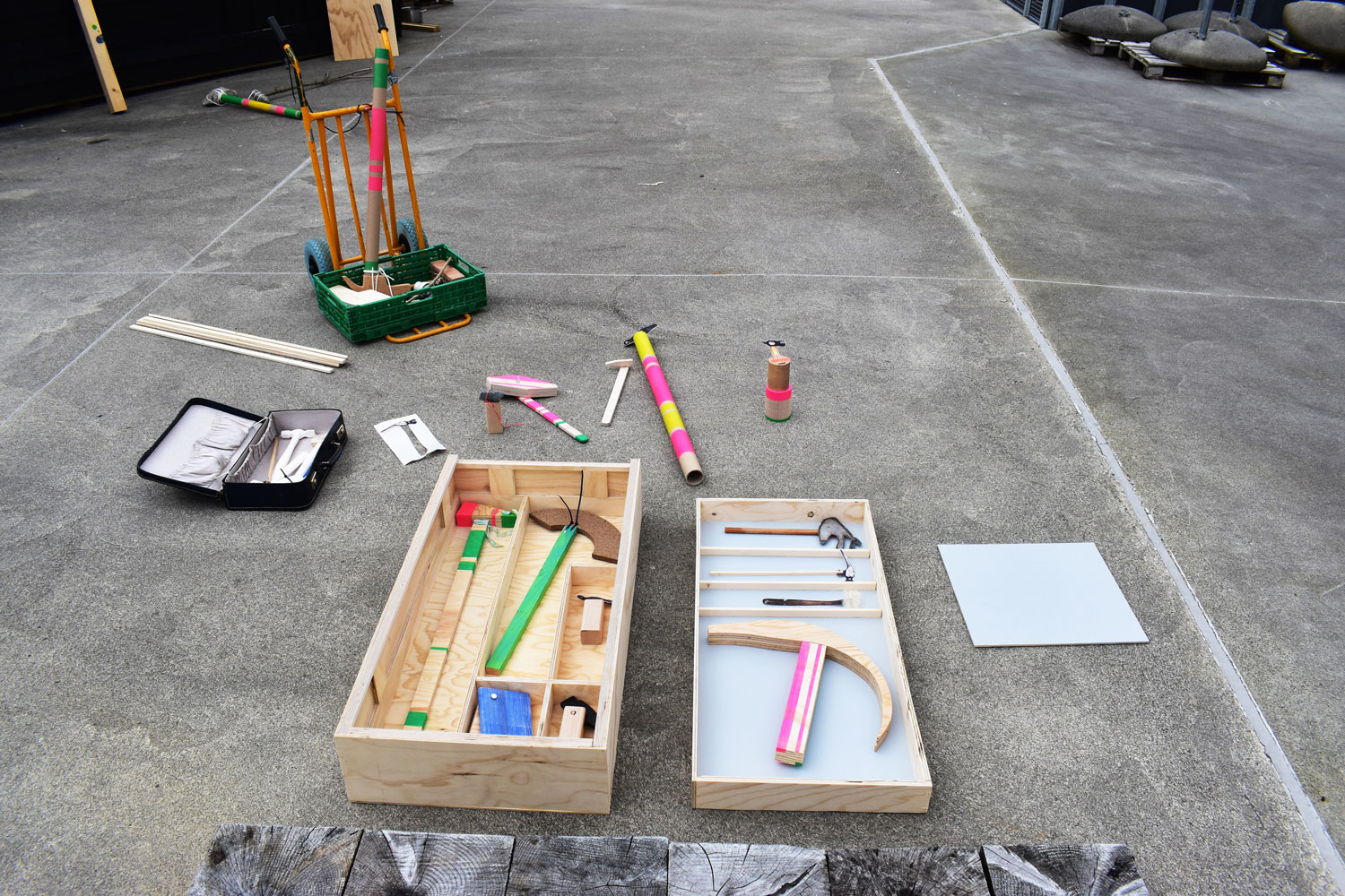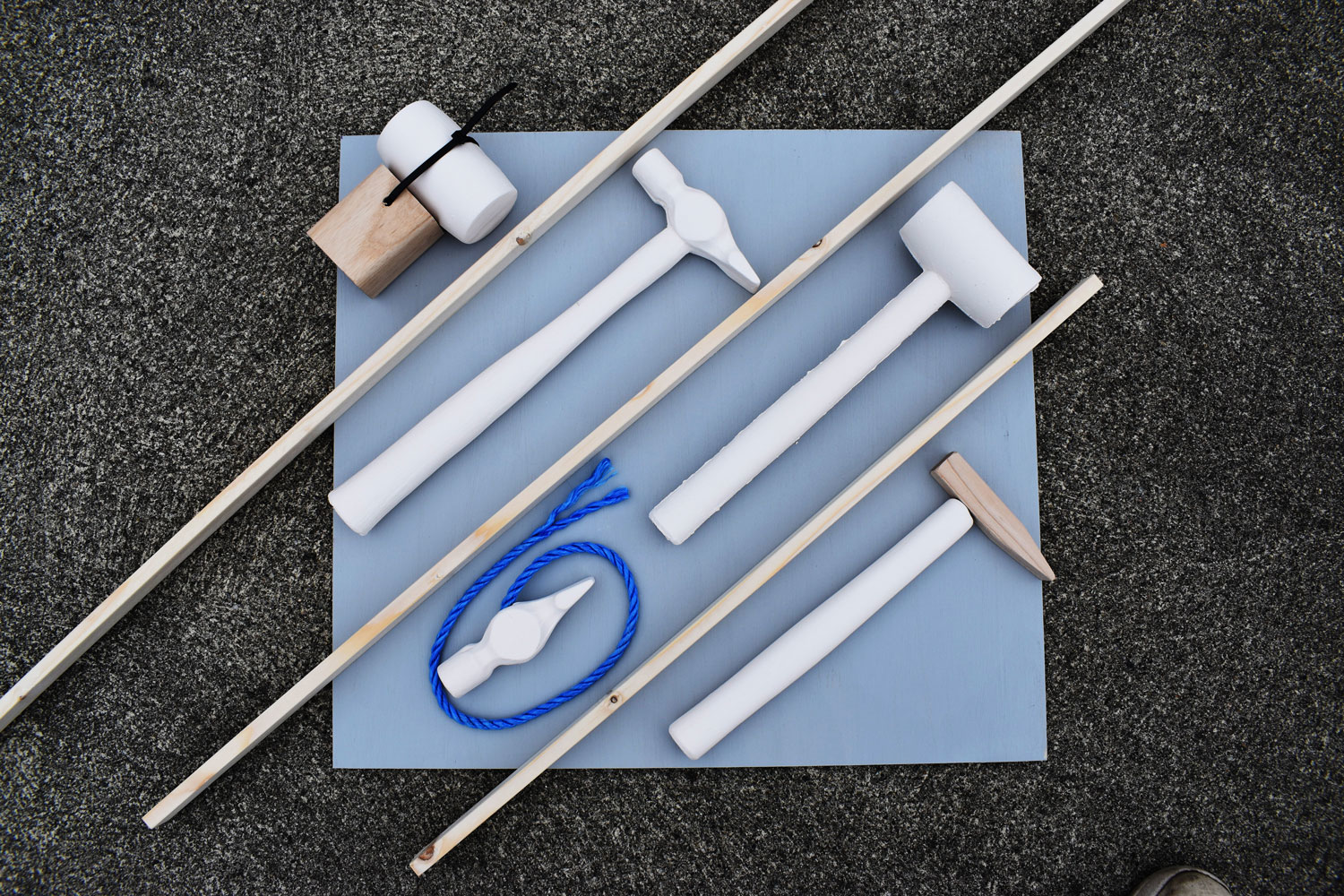 I put the biggest and most problematic hammers on top of each other. Together with Kristian, who is the master of the wood workshop, we start to talk about how fun it would be to make boxes that follow the outline of the hammers.