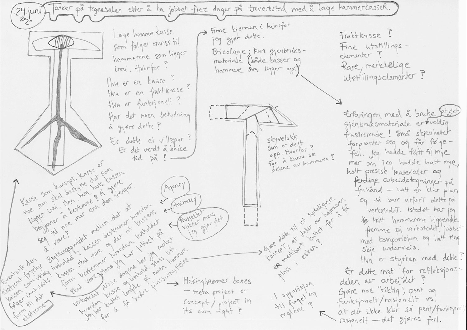 I notice as I write that I am more drawn towards the first; to let the hammers be in charge and take over the project, as this is closely linked to fundamental topics in my PhD project: Animacy, agency, disobedience, function etc.