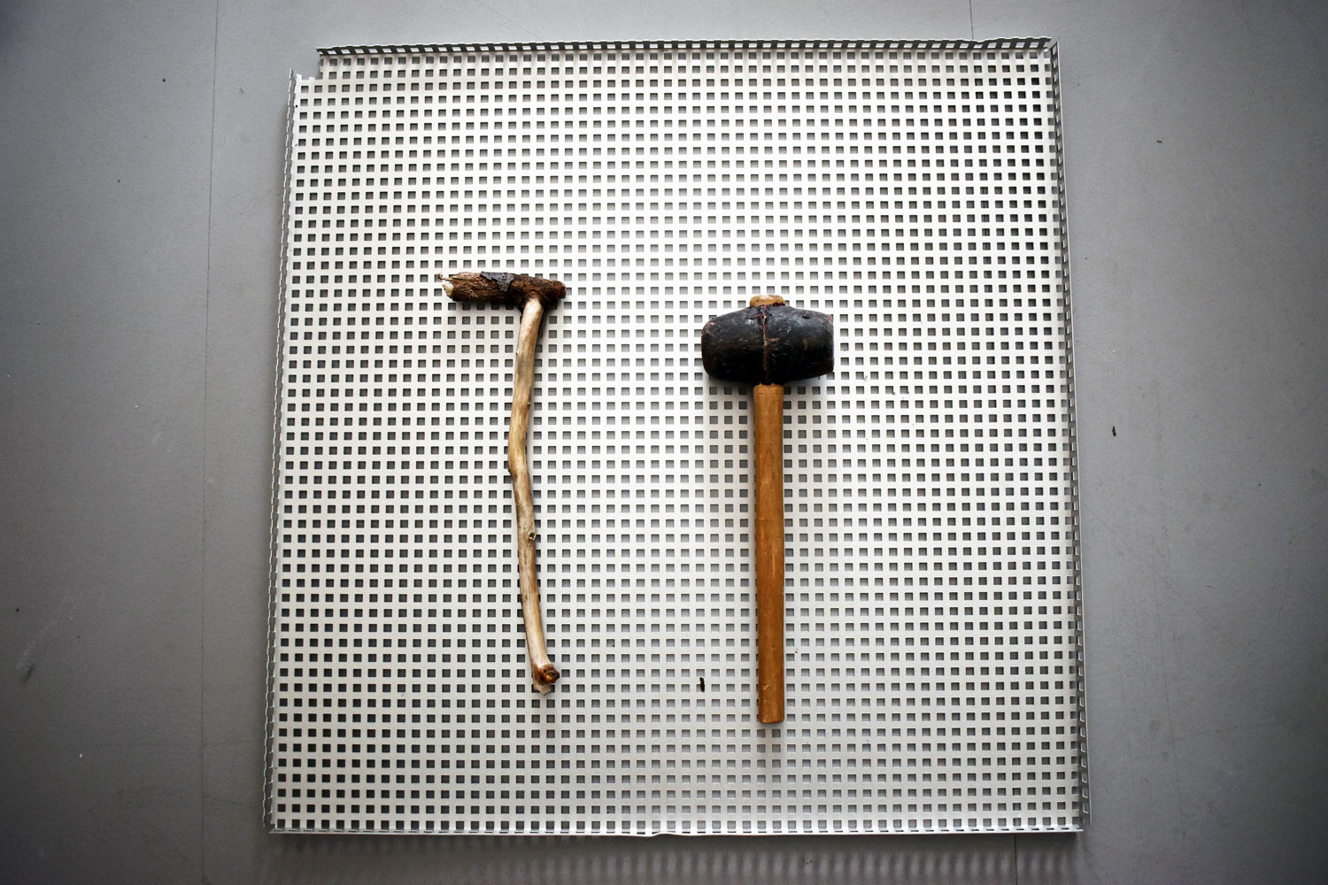 I'll leave this now, and I'm sure I'll figure it out when time is right – or more likely; the hammers will figure it out for me. For now I can make a simple rack that will serve as a preliminary hammer storage and display element. The perforated metal trays I've had lying around for many years will work very well for this, both as an exhibition item and as a storage.