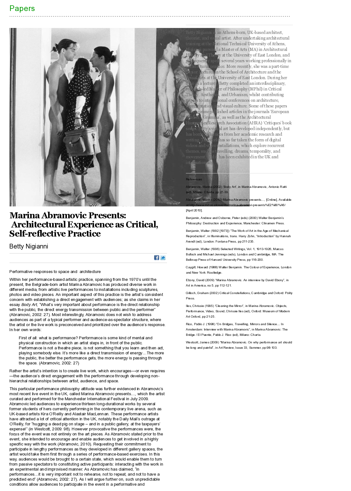 The article was initially presented as a conference paper on Marina Abramovic, at the Yale Centre for British Art, New Haven, 2010. I was invited with other international speakers. I was there for a week on a Greek visa. In 2011, I became British national by naturalisation.
