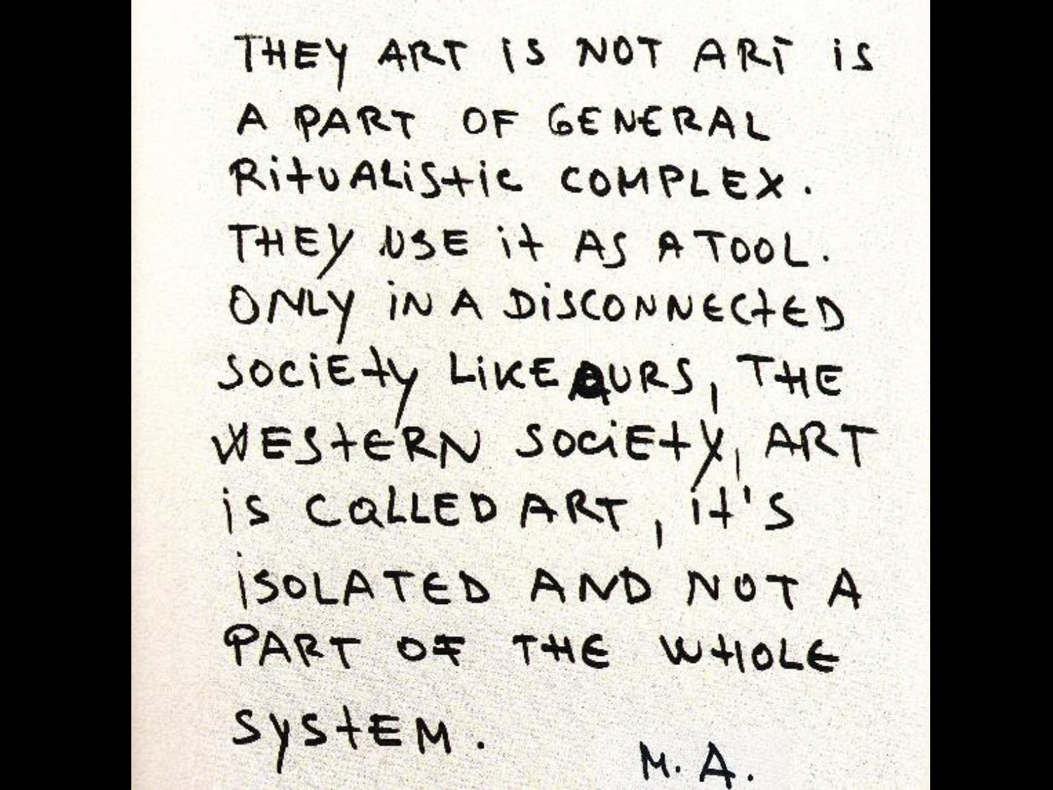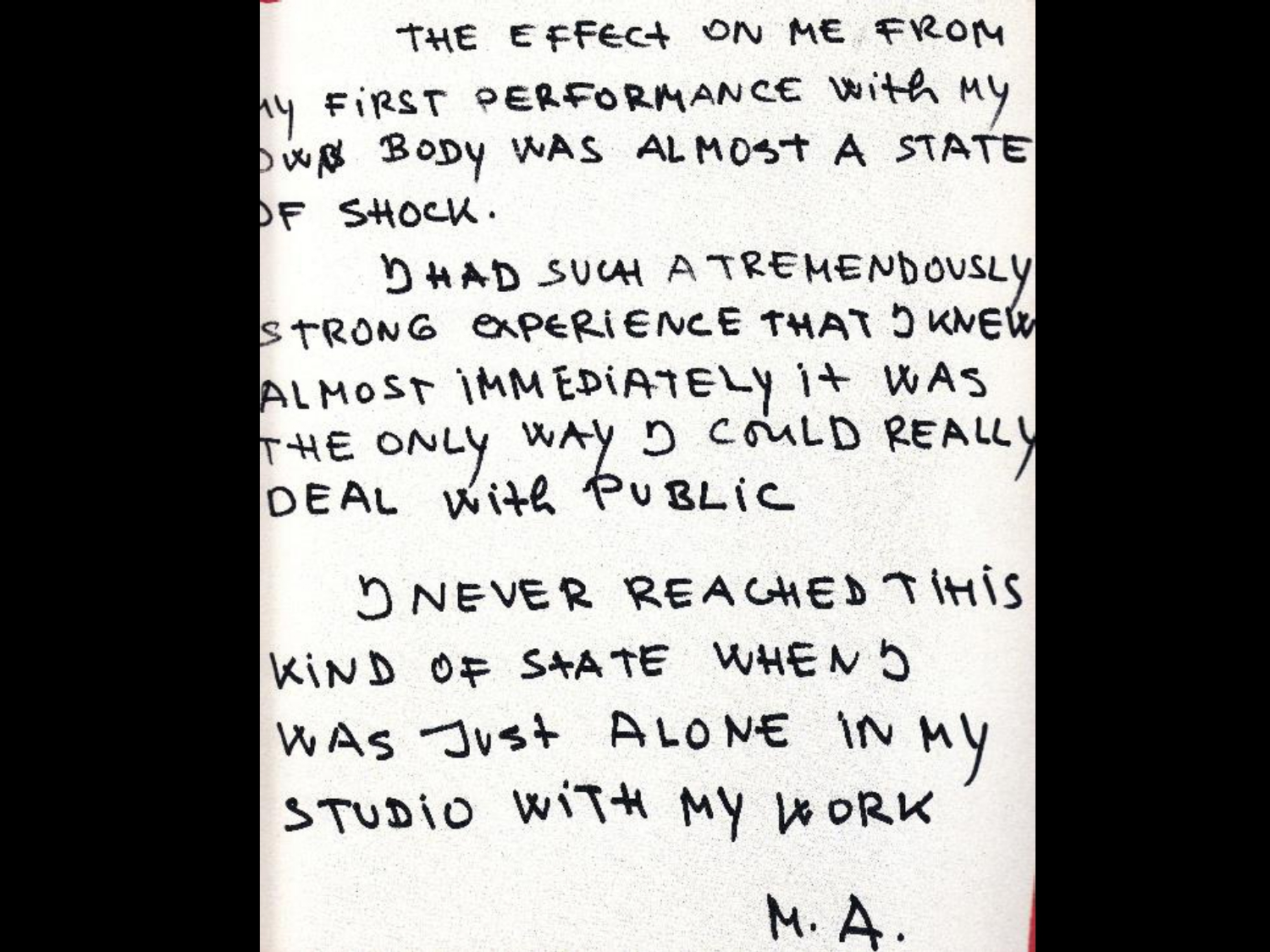 Abramovic championed a new lifestyle for artists, which was unconventional for her time, and specifically challenging with respect to her own performance art work. However, outside Abramovic’s very unique approach to art making intimately linked with her nomadic lifestyle, the culture of artistic nomadism has since developed: in the informal way of participating in workshops and traveling to view or to show in exhibitions and art festivals, as well as in more formal ways, by taking on artistic residencies or formal education.
