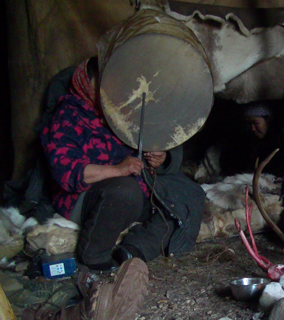 I was woken up at three in the morning. That is when the rituals of the Young Reindeer Celebration begin. As part of this ritual, a piece of wood, tied to a leather strap was spun against another piece of wood until it began to smoke and sparkle. A dried heather twig, which was laid on top, caught fire and this lit the entire fire. Some of the burning sticks were taken out and thrown on the ground in the tundra. Small pieces of meat and fat were also ritually thrown on the ground. Then all the inhabitants of the yaranga sat down by a wooden bowl filled with food and began to eat. This was done by every yaranga. The ritual is part of the Young Reindeer Celebration in August. Each household slaughters 2-3 calves, whose soft skins are used to make clothes for the following winter. I did not experience the collective singing that is part of the celebration, but in one of the yarangas, Yaatitval sat on the ground on a reindeer skin in the hostess's place, which is in front of the sleeping stall. She had covered her face with a large round drum, stretched with the transparent belly skin of a walrus, which she drummed with a supple whale bone, singing a long sad melody.
