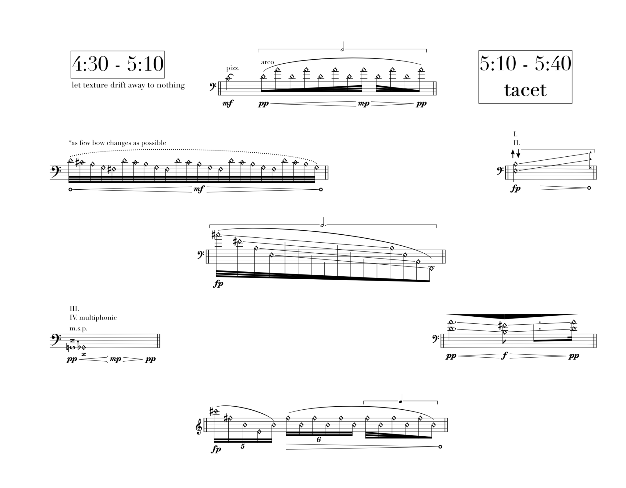 There are two ways in which ensemble material is written in the piece, which can be described — in referring back to Tsunoda’s notion of depiction — as “watching” sections and “portraying” sections. The element of “watching” comes from our relationship as listeners to the recording itself; it is laid out in its entirety, allowing us to literally just sit and experience it as it passes by. During these sections, the ensemble interacts with the material individually and at their own discretion; each player plays these sections from individual parts which contain no reference to the other players, only a selection of notation and timestamps specifying when to play. There is no score for these sections, just possibilities for the players to explore the sonic space and ‘watch’ as the field recording passes by, inviting the audience to do the same.