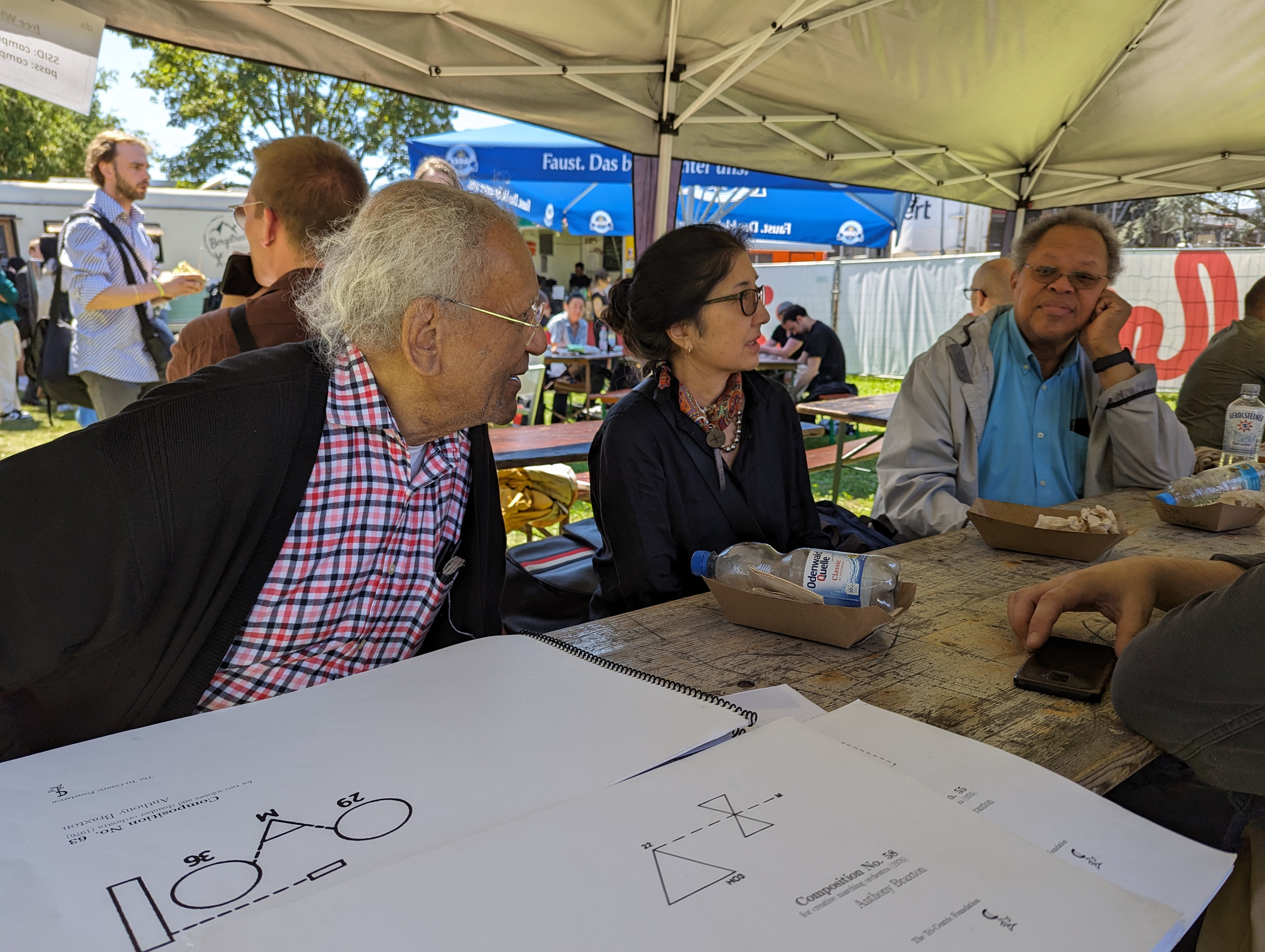 In August 2023, Anthony Braxton was invited as one of the central guests of the International Summer Course for New Music in Darmstadt, Germany. This bi-annual festival has been historically very influential for the development of post-war Western art music and still today is considered one of the most important gatherings of the international new music community. Anthony Braxton’s extensive body of work has existed largely outside the official discourse and historical canon of Western Art Music. His presence at the Darmstadt Summer Course was an important statement to give his life’s work the attention it deserves. Several performances around his work were planned, as well as a two-day international conference which I co-curated with Prof. Timo Hoyer.11 After my experience performing Creative Orchestra music with the students of the RCA, I suggested to festival director Thomas Schaeffer the idea of organizing a workshop around Braxton’s Creative Orchestra for participants of the Summer Course. He gladly accepted, and in turn, suggested I would co-lead the workshop together with Braxton himself. We decided on a four-day workshop with 3-hour sessions on each day from August 11 to 14, followed by a public performance on August 15.