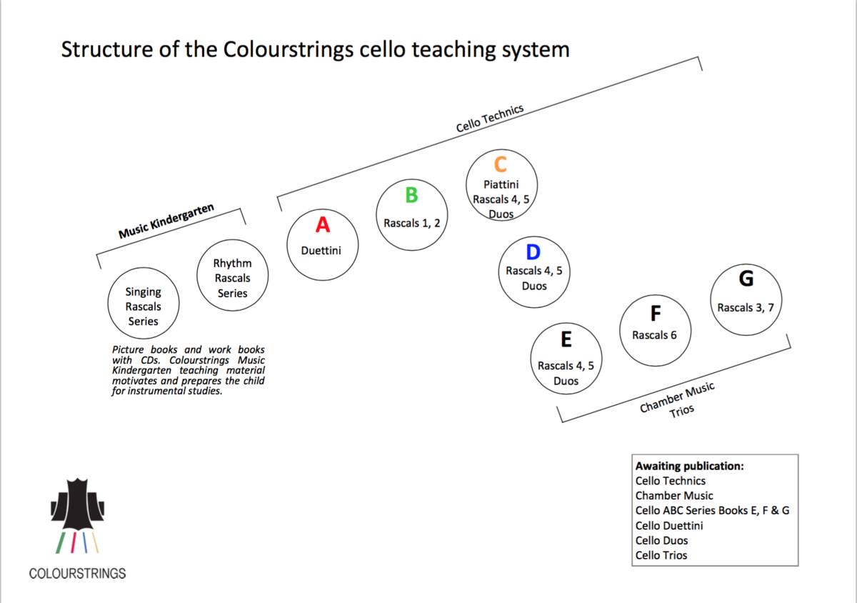 The Colourstrings-education consists of the Singing and Rhythm Rascals in the Musical Kindergarten, the method books Cello ABC and the additional volumes with pieces and studies. This is the structure for Colourstrings cello teaching in a diagram: (63)