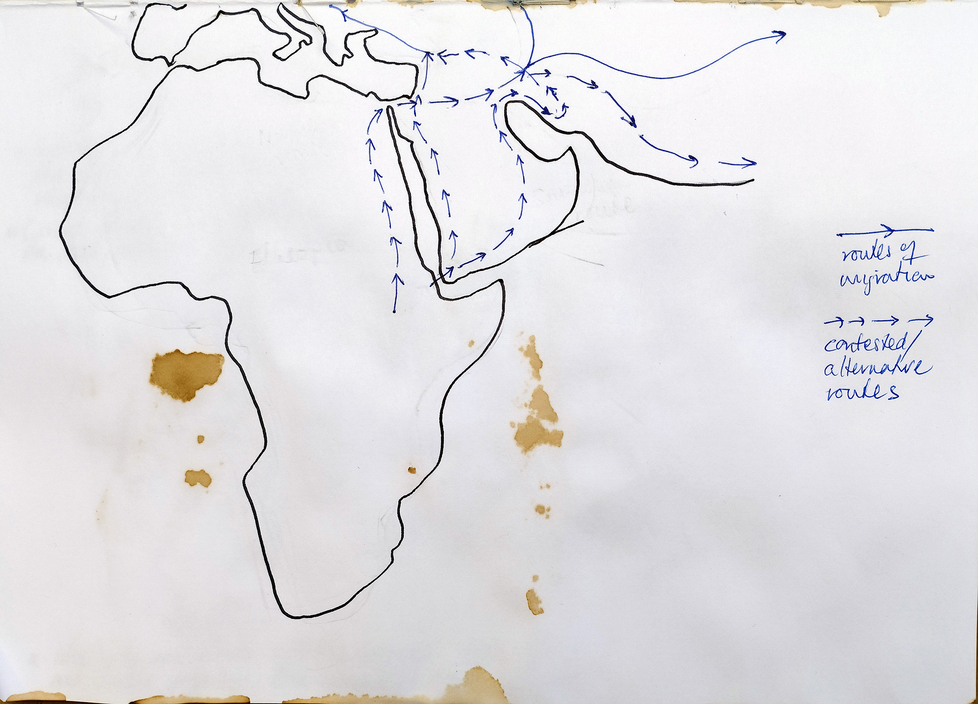 Fig 21: Sketch of Africa and migratory routes of Homo sapiens. Coffee stain, ink, biro, on paper, 29.5 x 20.5 © Michael Croft