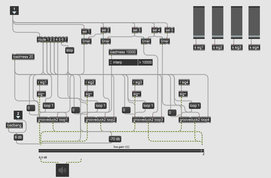 The loops get recorded and stored in buffers that can reach up to 20000 milliseconds, however, the playback time of the loops is measured by the time interval between clicks on the green button (cf. timer object). The Wave ring is mapped to the 4 sliders, which are each connected to a single groove object, determining the speed of the signal for each loop. The speed of the signal of course changes both the pitch and speed of the sound. They use a different Wave function, as it was difficult to capture three-dimensional accordion playing in one function.