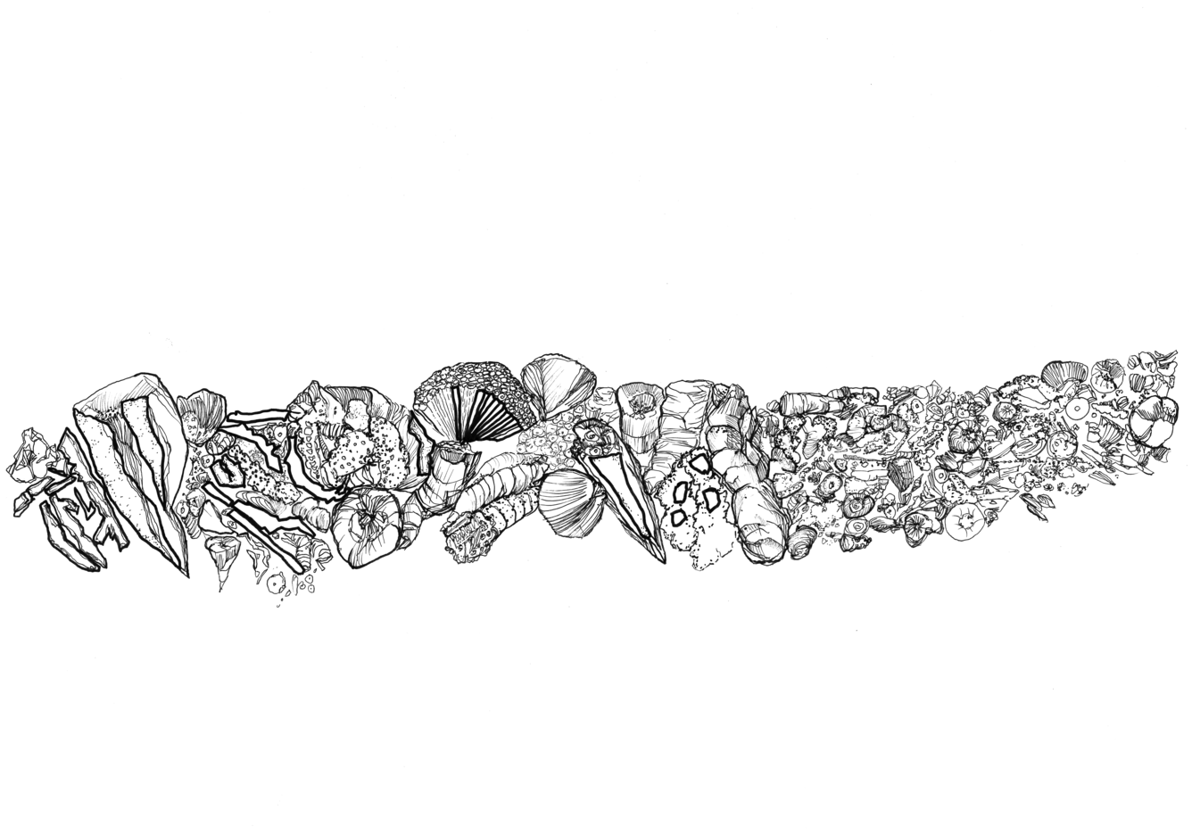 Based on the fossil imprints found in the Historical museum's three staircases, Närhinen endeavours to depict and to re-trace outlines of the coral reefs by means of ink drawings drafted on translucent plastic film.