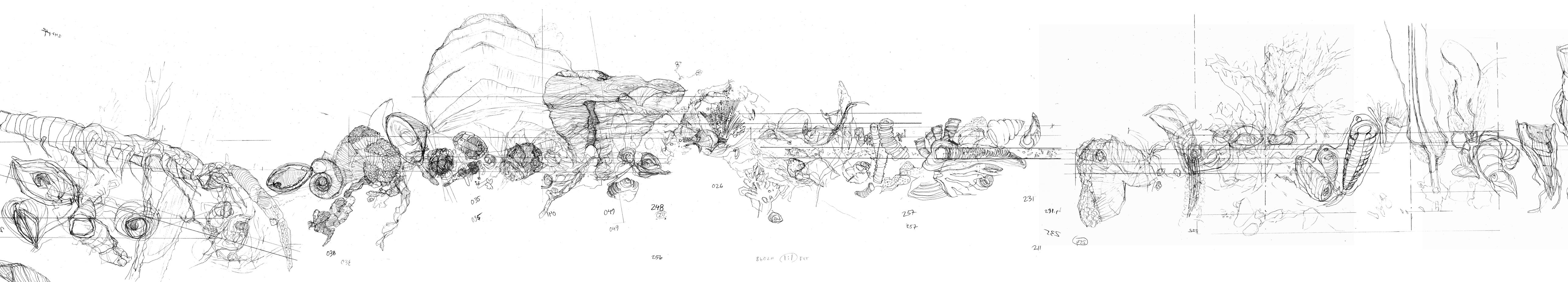 The drawings measure 441x66cm and 406x66cm.They are based on the fossil imprints found in the museum staircases.