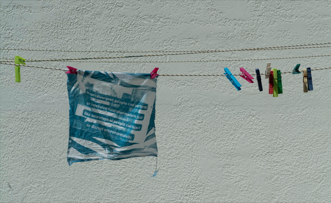 Lovis Heuss' work "digestion in blue" is a textile collage of their current research on the neurodivergent coping strategy called masking. Citations of the academic research are paired with Lovis' documentationd of their personal unmasking practice as well as questions which arose during the unmasking workshops they created. Inspired by "disability as method", the arrangements are an approximation of neurodivergent information digestion through the process of cyanotype imprinting and weaving.