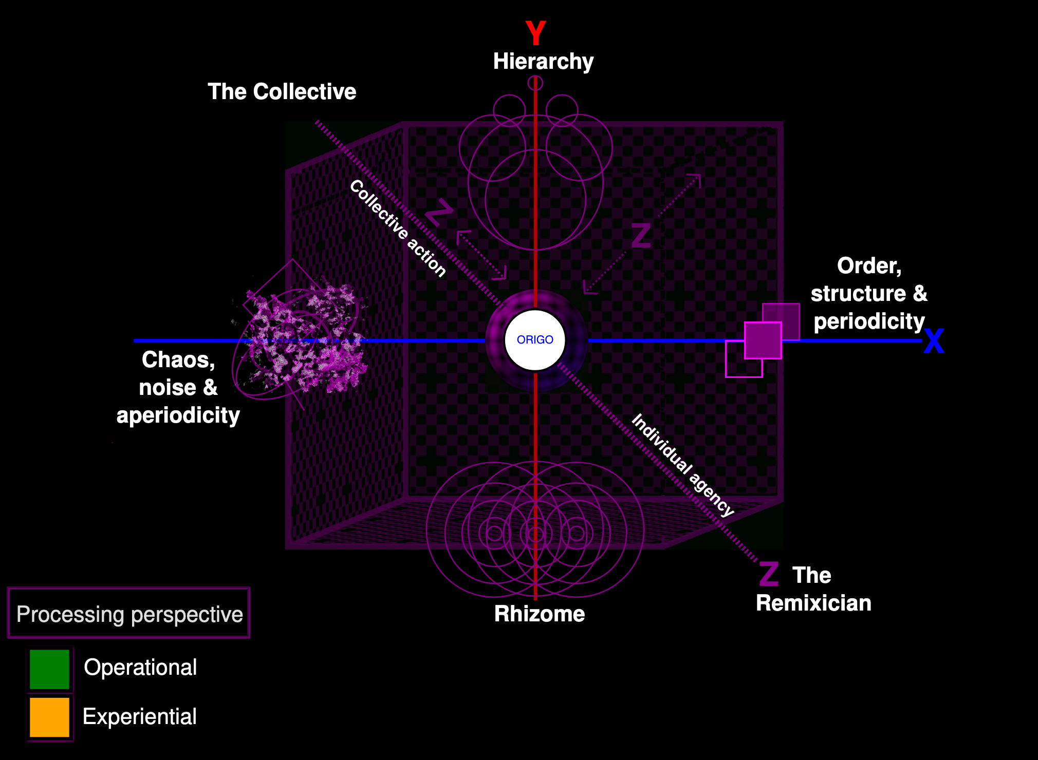 Given the dynamic nature of live remixing, the nodes will move, oscillate, attract or repel each other. Changes in operation is likely to change the experience and vice versa - by informing operational decisions.