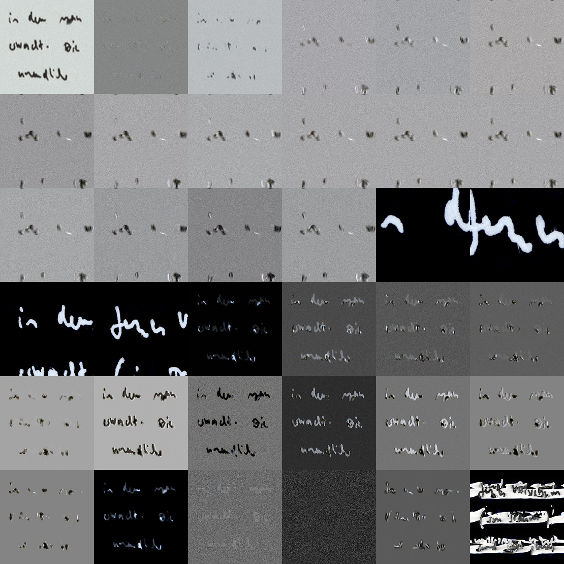 This piece is part of the inner-space eight-channels video installation. In it, multiple things collide: The strange and archaic quality of handwriting that nowadays seems to have been superseded by note taking in the digital domain only; a notation from a dream diary, detailing a dream in which the topic of radical constructivism is touched, the peculiar contact between human and machine, the topic of interiority and exteriority; it is based on the scan from a notebook that was also transliterated into the vinyl text floor piece "spokes" as a sorted digital text; a process of exploring the structure of lightness of scientific microscopy, where articulations exceed from a neutral gray fond towards black and white; an explorations of the transition away from semantic deciphering to a purely graphical quality, employing a newly developed algorithm for combining successive parts of the text through space-local convolutions, with their parametrisation changing from channel to channel, each time giving particular quality to the interaction and rhythm of the text with itself.