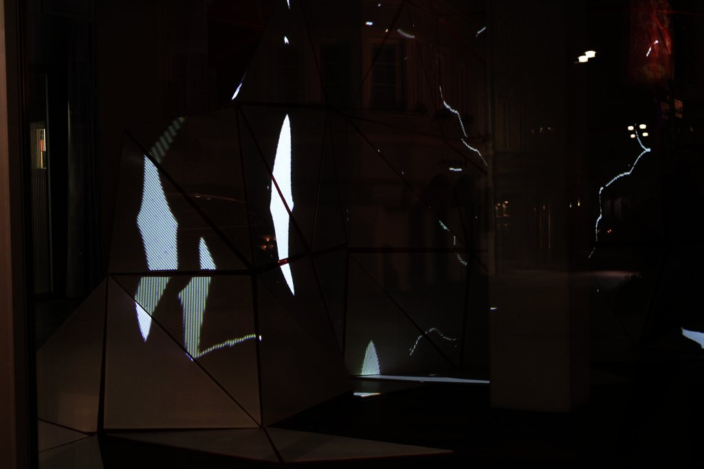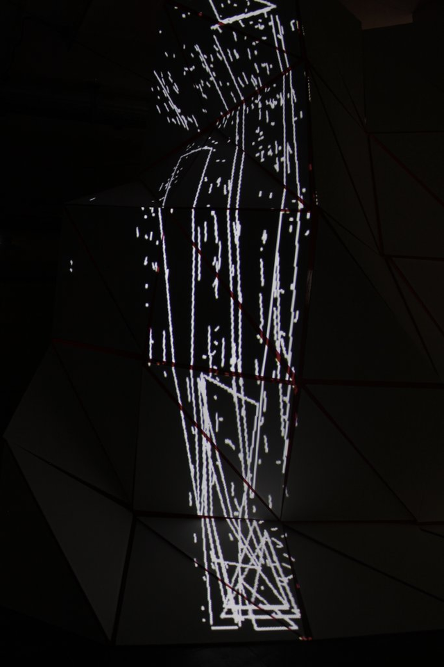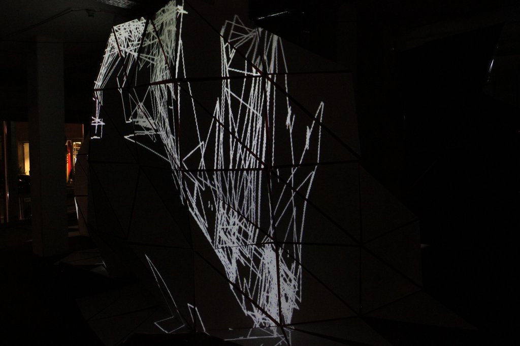 What happened in the space was very interesting. The mesh surface, predictably, transformed the quality of the projected image immensely. After some testing, we settled on a rather simple projection mapping whereby a set of virtual triangles is mapped to the triangles of the mesh, preserving straight line segments on each triangle. The image obtains a new depth, as pixel sizes begin to vary, as brightness varies according to the relative angle of the triangle towards the projector. The clean alignment structure seen with the photographs on a regular screen gives way to a more complex structure, now crawling across the mesh as an entire new topology of the imperfectly reproduced space. The gallery space is not empty any longer, there is a huge structure in its middle, and so at times the camera is inevitable engaged in a feedback situation, at other times it captures an empty part of the room, at other times it looks outside the gallery windows. This results in a rich variation of the density of the projected image, from very sparse constellations to very dense flocks.