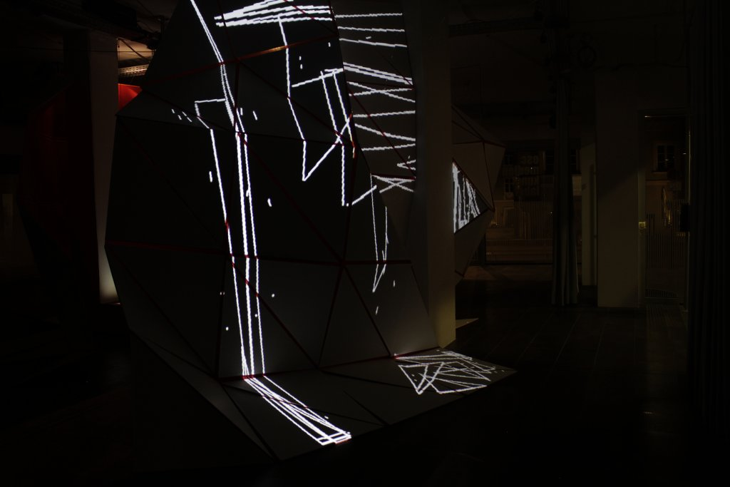 Early on in the project we decided to create a spatial hull, the triangle mesh that Lisa designed, and use it as a skin for video projection. Interesting questions arose around how to achieve the projection onto the three dimensional object. Should we use projection mapping, should we aim for an independent image, should we skew the image, should there be a beginning and ending point, should there be interruptions by columns of the space, etc.