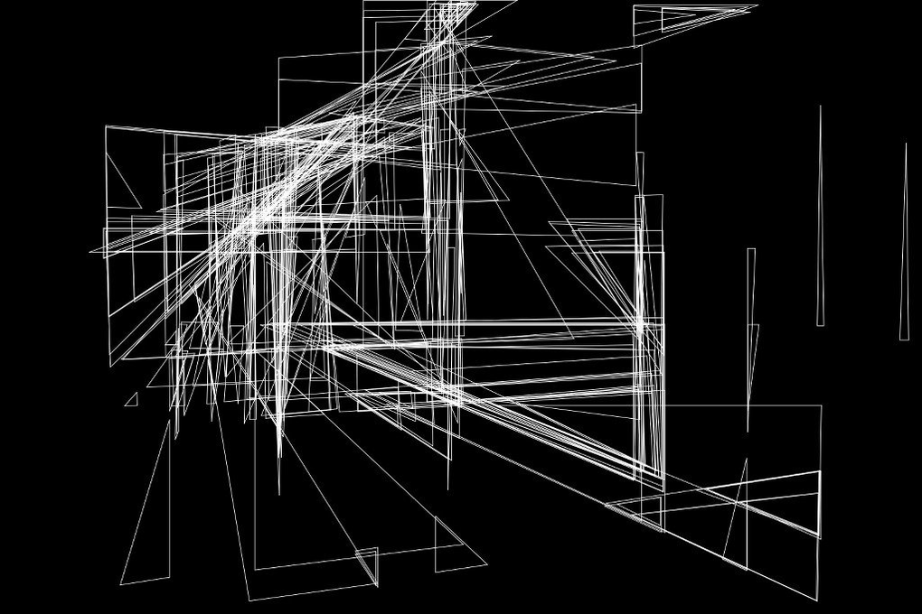 How these procedures translate into actual aesthetic objects was also subject to various changes over time. I began experimentation with high resolution daylight photos from the esc space, and a first version of grouping the lines to triangles. The result are images showing clearly the alignments of the space and yieling an architectural quality. The pre-processing, that is the way the input image was filtered, adjusted in contrast, and fed into an edge detection algorithm, had strong impact on the way the triangles would eventually be formed.