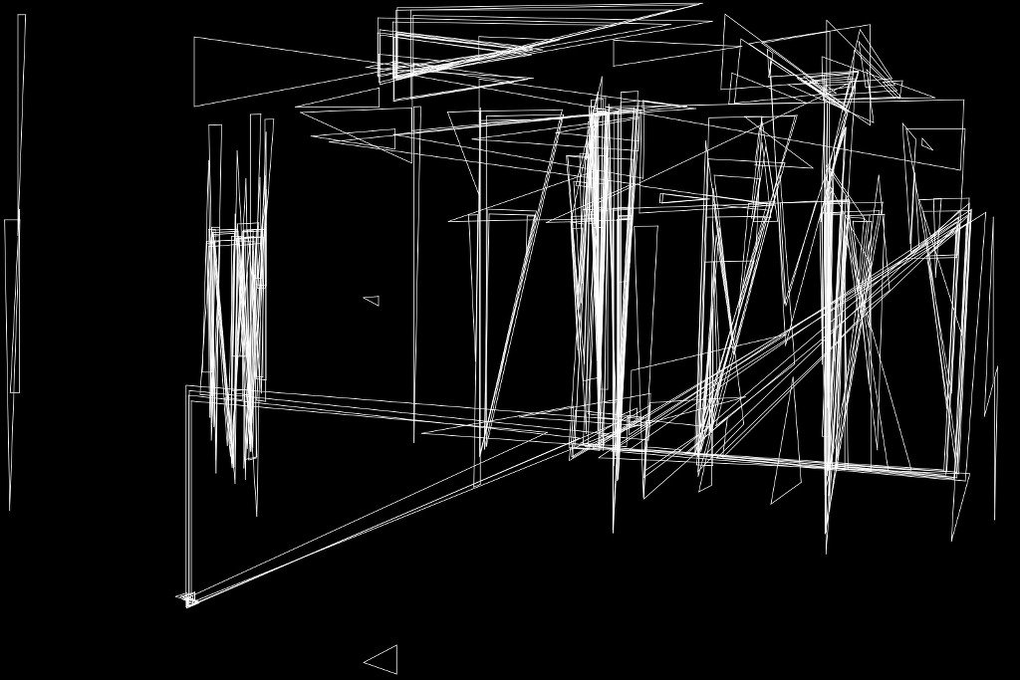 The piece takes real-time snapshots from a surveillance camera mounted in the gallery, sweeping almost 360 degrees to analyse the space. The algorithm then uses a variant of the Hough transform to first decompose the image into lines, followed by a stage that tries to connect these lines to form triangles. A third stage addresses the question of the constancy of objects—it makes hypotheses about whether a triangle in a successive frame is still "a same" triangle as one in the previous frame.
