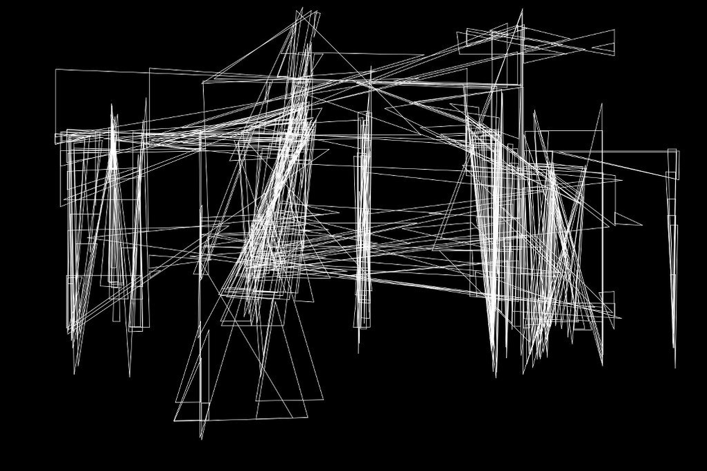 At one point, there was a small glitch in the code that resulted in incomplete erasure of the image background, with triangles extending to the very boundary of the screen leaving behind traces. The trace structure depended highly on the parametrisation of the force-directed animation of the lines. Lines would either appear and disappear, if no preceding or successive coherent triangle was found, or they would by accelerated by this force vector to slide from frame to frame, in this case leaving characteristic curved blotches. The fact that these traces remain still was very interesting to me, giving a counter-point to the expected animation of the graphics. Each iteration, lasting a few minutes, would give rise to one entirely new pattern of traces, and even after watching the process for a very long time, there was always an unforeseen way the interaction between the components of the algorithm would play out. One day, the camera communication had crashed, but the other part of the system was still working, sticking faithfully to the last analysis carried out and producing a strict horizontal lines as the trace pattern, something I had not seen ever before.
