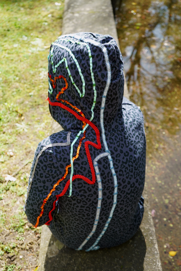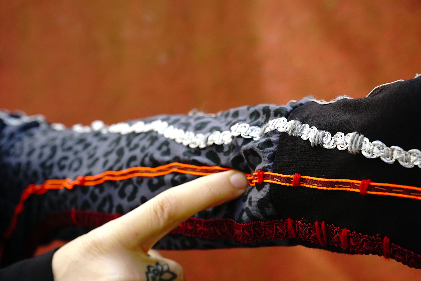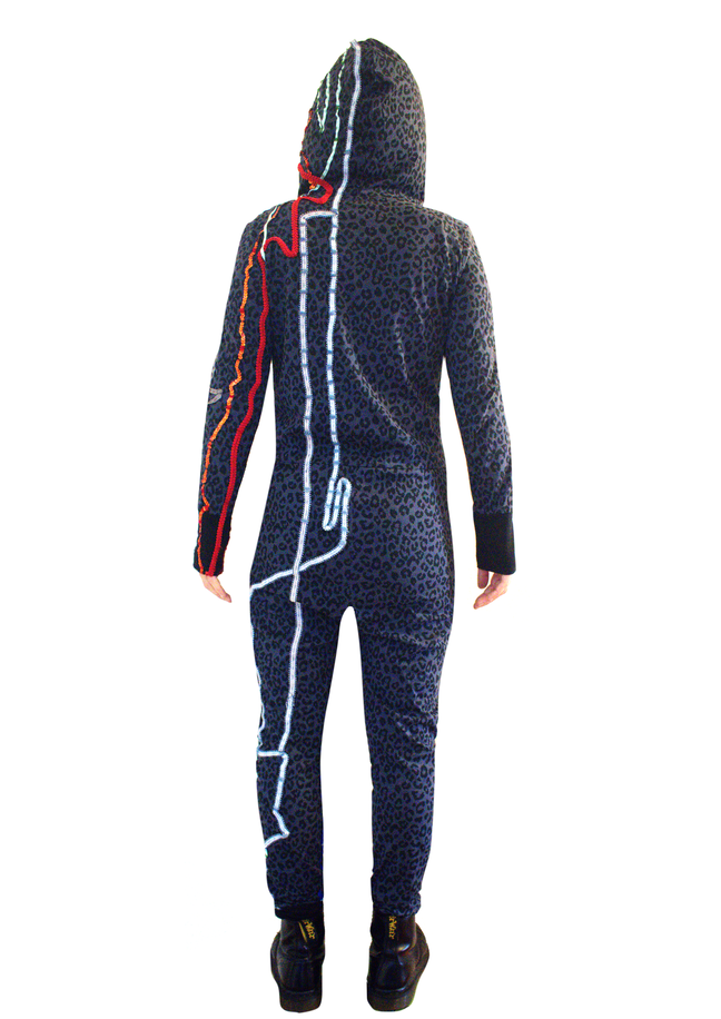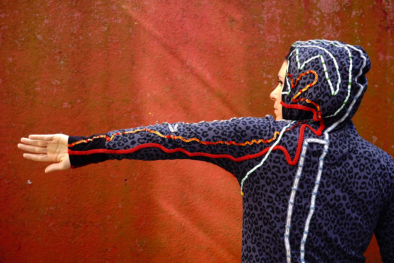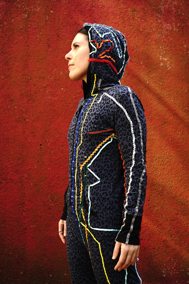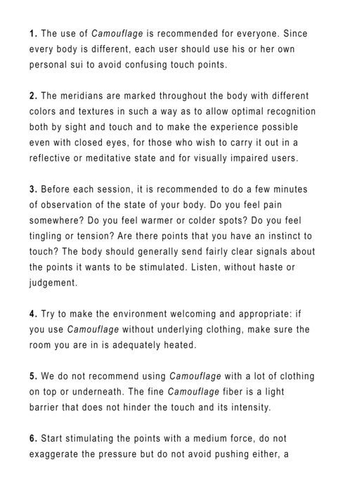 "Camouflage" is a clothing that functions as a healing device for the practice of self-massage. The garment, designed as a second skin to be worn, makes visible the map of the main acupressure points on the body and the energy lines connected to the organs, called Meridians in Chinese medicine.