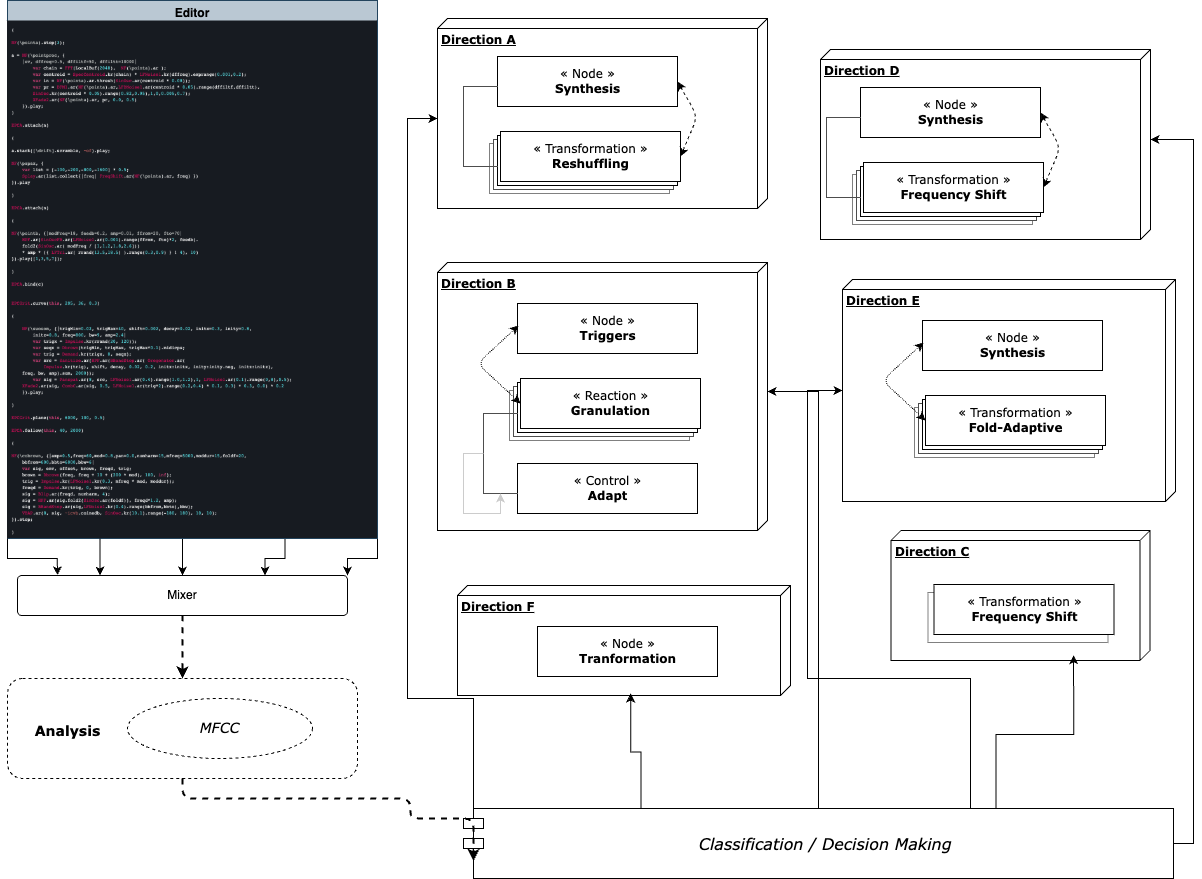The music is mostly relational in the sense that any notion of ‘sections’ or ‘transitions’ is caused by the properties and details of the synthetic sounds. All source processes are defined in relation to other parts, resulting in a ‘material network’ or ‘sound configuration’ that could be activated differently. Thinking relationally and bottom-up also allows the musical structure to be considered a network with different points and connections that spread without any single point of failure. The creative work then involves making new material, introducing it and following the ongoing process. The observation process was first created through triggers, so when the analysis reached a predefined condition, it would trigger suitable responses. In a later stage, the triggers were replaced with a classification algorithm that was trained on different sounds during the preparation phase.