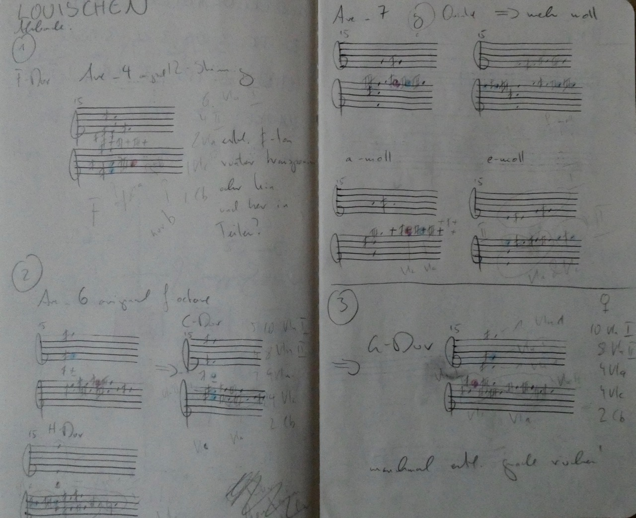 The following is the first section, which relies on a continuous floating harmony. A harmony that rests within itself and simultaneously floats in my ears. All these statements about expressions, of course, have no general validity but are my subjective perception. The chords from "GEBET" are paired with a simultaneous counterpoint that meanders between the first desks. Initially, one after the other in a circle, 1st violin, 2nd violin, viola, cello, later crisscrossing through the desks. The counterpoint is in the register above the chords.