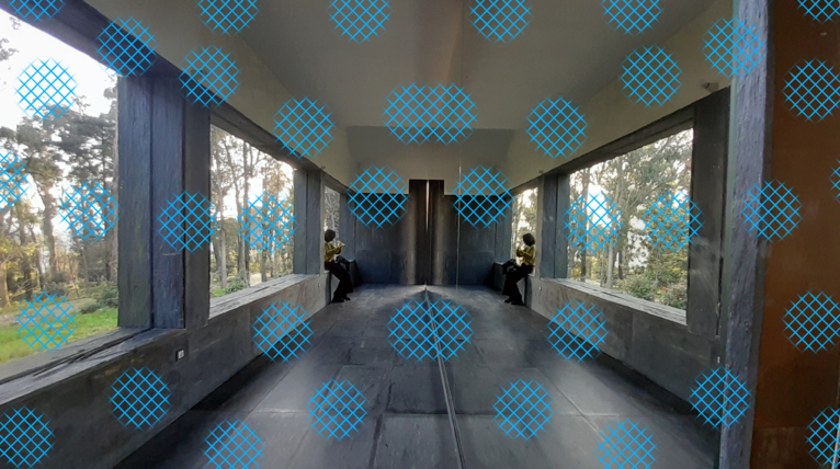 The first time I entered this little house in the Parque das aguas, there was a girl playing the flute. So as not to disturb her, I stood watching her from the side and saw her reflection in the mirror. The music together with the mirrored image created a dreamlike and relaxing atmosphere. I shot a video and took a photo, with which I experimented at home, imagining how objects, colours, patterns, could interact with the imposing mirror of that place