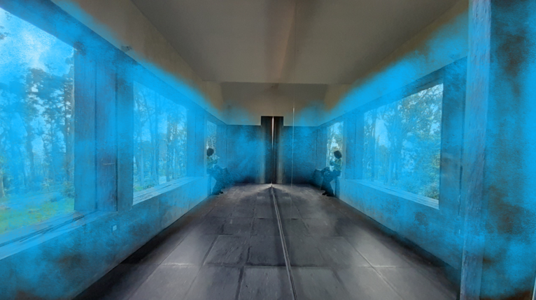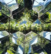 The idea of working with the mirror reminded me of the Kaleidoscope, which symmetrically reflects coloured objects in motion, and made me think of the fragmentation and reconstruction of reflections that the eye perceives. So I thought that if instead of moving objects, the viewer would see himself inside the reflected forest, it would be like seeing his own fragmented self, a kind of disintegration of the ego inside the echo, that is, inside nature. The effect of feeling and seeing oneself as a fragment within the forest, becoming part of it, disintegrating one's 'narcissism' made me think about the concept of the work.