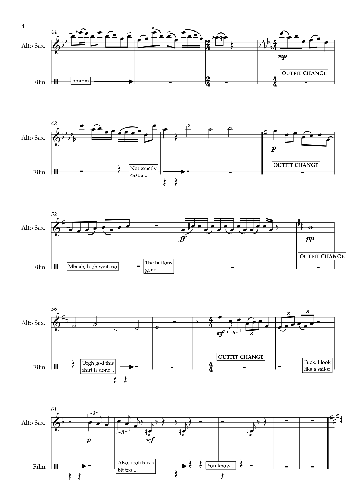 Developing on from Escapism I wanted to explore whether I needed to adopt a multiple movement structure of blatantly working-class movements to allow space for more emblematic classical music. I also wanted to return to explore more explicit aspects of classical music’s culture (such as musical form). In Theme With Variations Forced by Expectations for Alto Saxophone and Film, I reconstruct the idea of a theme with variations to address ideas of code switching in working-class experiences and the impact of these changes on personal understandings of value. Code switching is a process wherein people from outsider communities adjust their personalities and identities to better suit the dominant environments they interact with (see Gardner-Chloros, 2009). In considering class-based experiences of code switching (see Ashcraft, 2012), Theme With Variations Forced by Expectations uses several scenarios as an impetus for causing changes to the musical theme. These scenarios are: