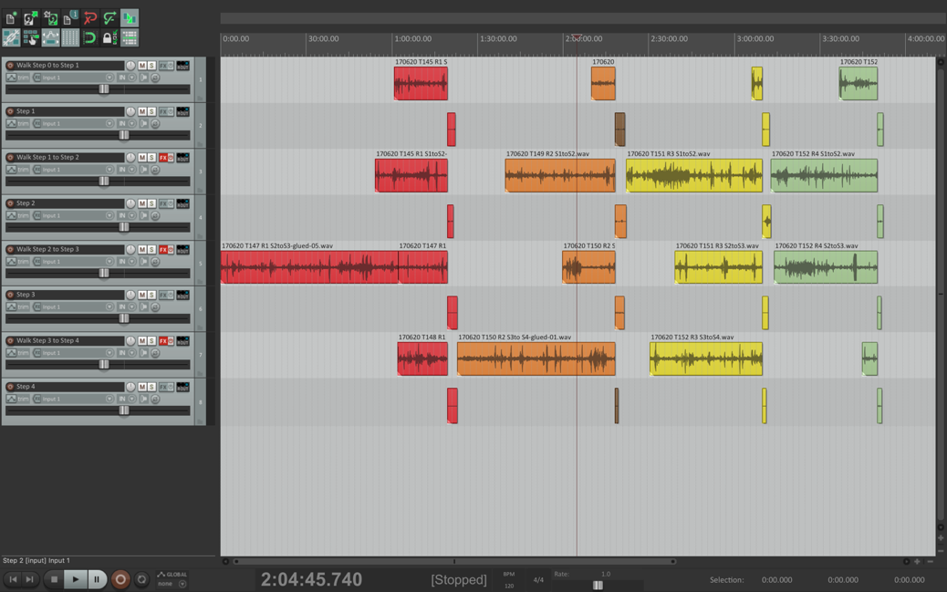 Reels 1 to 4 are sequenced left to right. The recordings from both walk 1 and walk 2 played simultaneously for each step.